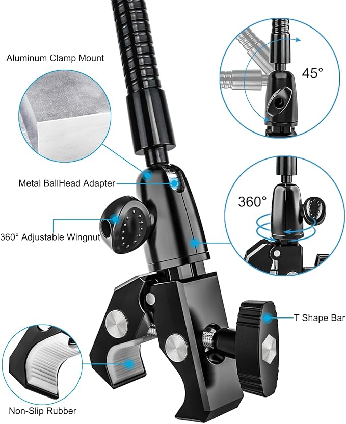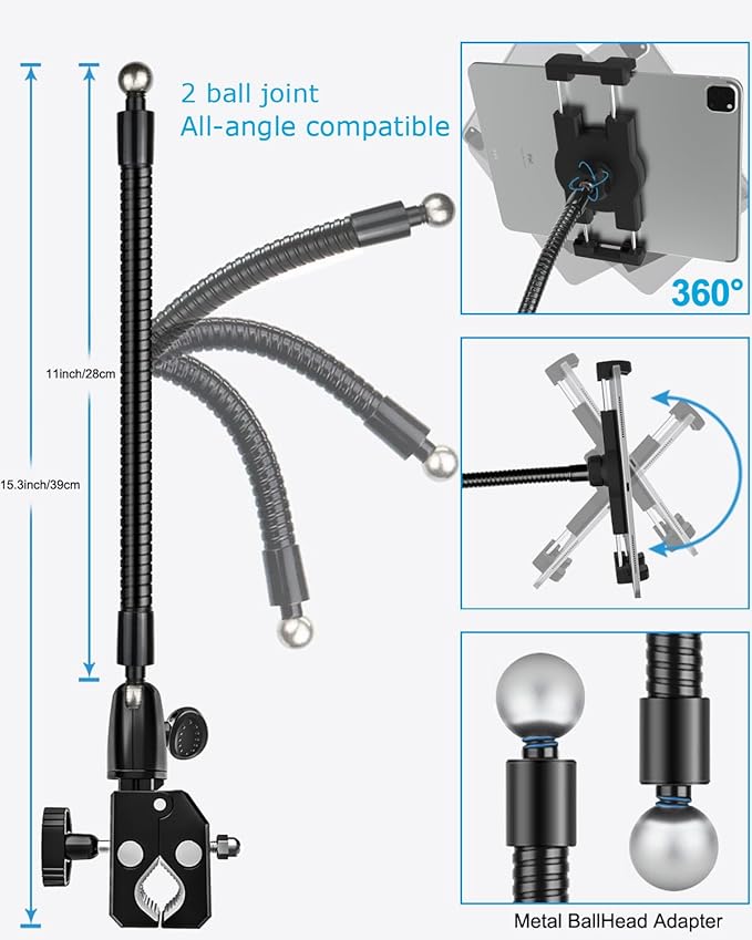- 【Two-end Ball Joint, All Angle Available】The fitness handlebar mount for tablet PC with 360 degree rotation ball head; The connection between clamp base and arm also built-in metal ball for 360 degree swivel and 90 degree adjustable. Long metal gooseneck design provides youe extra viewing angles (horizontal, portrait, tilt up and down) and ensure the smooth exercise experience for you. Ideal for watching videos, TV show, listening music or have video call with friends while exercising.