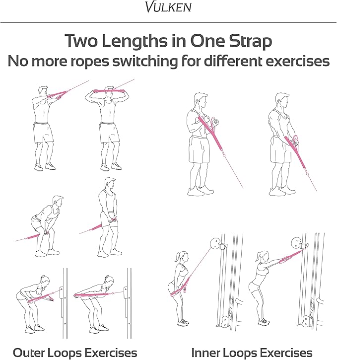 • One Triceps Rope for Diversified Exercises – No need to switch between multiple triceps ropes of different sizes for various exercises anymore. With the Vulken triceps strap, you can handle it all with just one rope. Its two-lengths-in-one design provides great versatility to your workout routine by allowing you to easily switch lengths between different rope exercises such as face pulls, triceps pushdowns, bicep curls, and more cable attachment exercises.