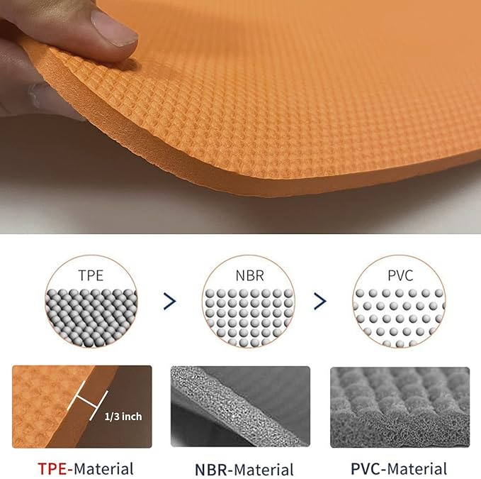 - Eco-friendly TPE Material: More expensive but worth it. TPE is the latest technological improvement to the traditional yoga mats. Our mats are made of SGS certified TPE material which is non-slip, Easy-to-clean odor-less and excellent in cushioning, unlike those cheap & traditional . They are truly eco-friendly, healthy.