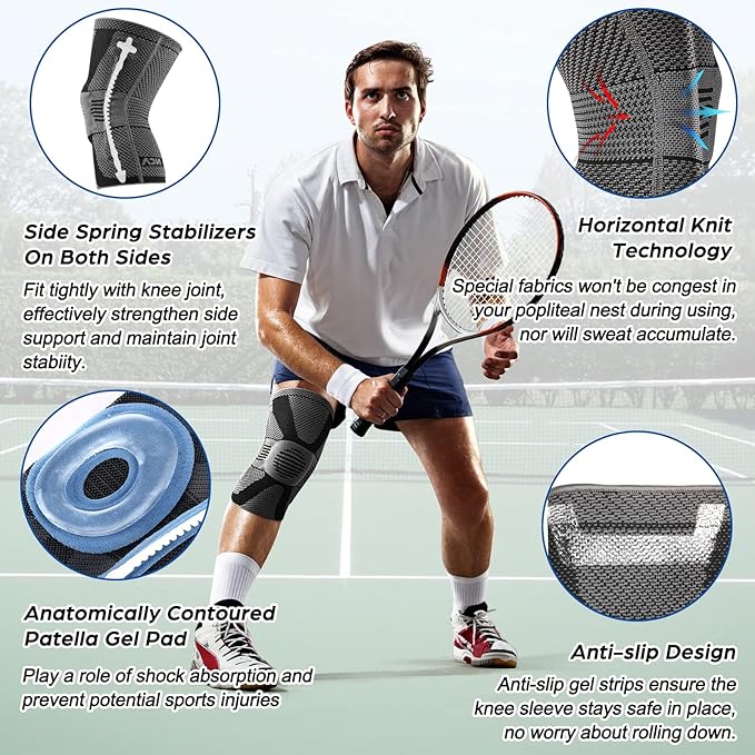 - UPGRADED DESIGN— Adopt the Anti-Inflammatory Therapy, overcome the defects of similar products, medical knee sleeves with no allergies and itchiness. With high-elastic tight and breathable compression fabric to fit perfectly with your knee curve, 3D structure of woven, high-precision knitting cutting technology. Side spring stabilizers on both sides and patella gel pad won't fall off easily during using, Non-slip gel strips to avoid slide or roll during exercise, It will stay in place all day!