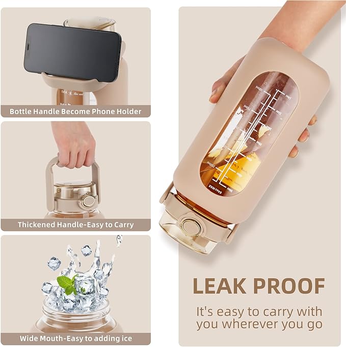 - Glass Water Bottle 64oz :The water jug with straw is designed with high-quality silicone sleeve to protect water bottle from slight bumps. In order to make the half-gallon(2 liters) big gym motivational water bottle easy to carry we have equipped it with handle. Wide-mouth opening make it easy to fill with ice cubes & fruits and daily clean