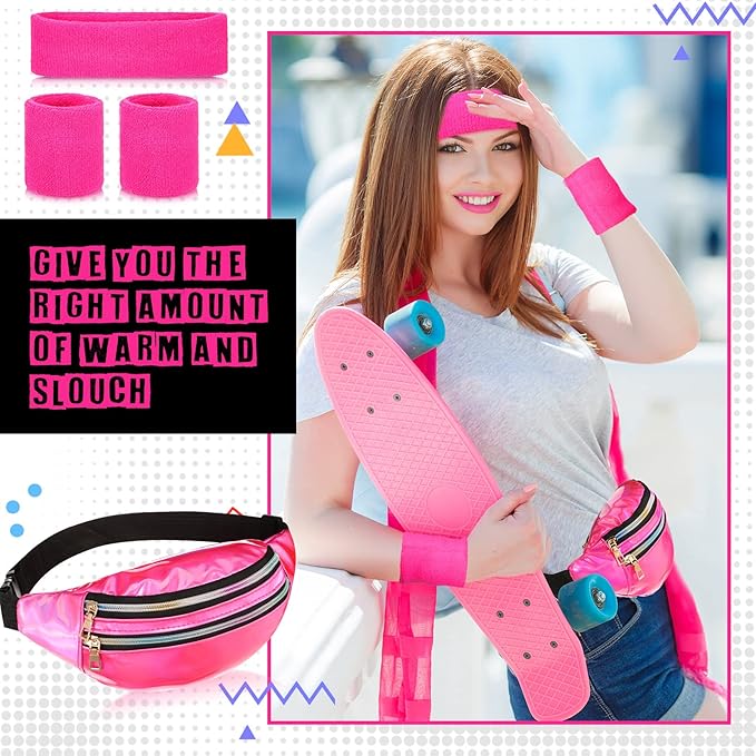 - One Size Fits Most: these soft slouch socks with 9-11 USA size, about 14 inches/ 35.56 cm long, enough length for you to pull them over your knees, or let them stack around your ankles; The neon headband is about 7 inches/ 17.8 cm in diameter, 2.16 inches/ 5.5 cm wide, and the sports wristbands are about 3 inches/ 7.6 cm in diameter, 3.15 inches/ 8 cm long, suitable for most girls and women; The shiny waist bag is proper to store cosmetics, skin care products and more