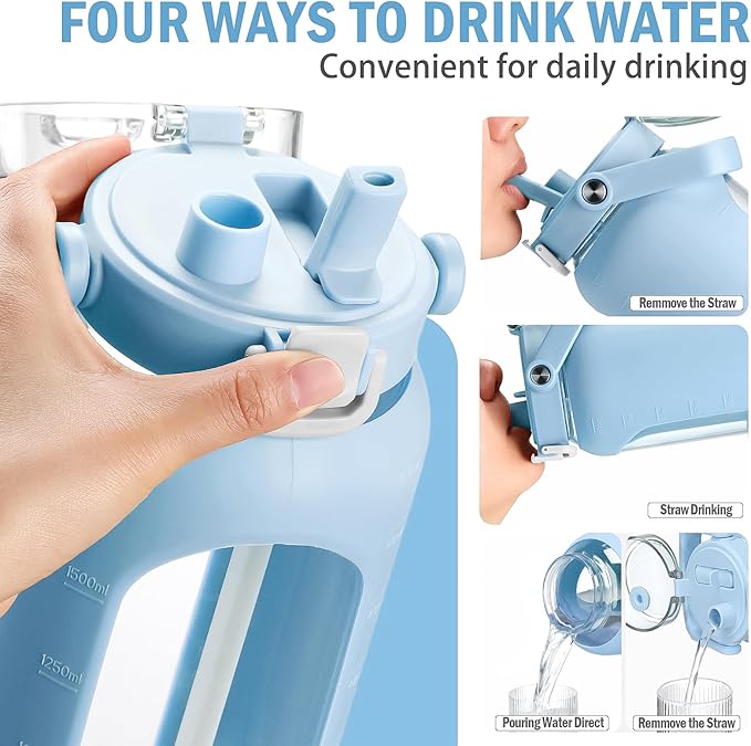 BLUEGO 64oz Glass Water Bottles with Straw Time Marker Half Gallon Large Motivational Water Bottle with Silicone Sleeve 2 Liter Large Glass Water Jug for Gym, Sports& Workout, Daily, Light Blue