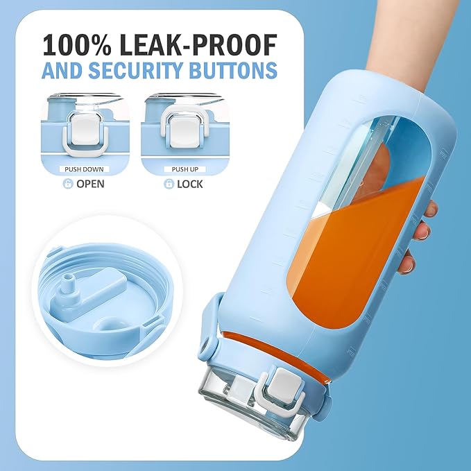- Lockable & Leakproof Flip Lid: The handy, lockable flip lid prevents leaks and can be opened with one hand for those times when you’re on the move and your arms are full. Our leak-proof glass water bottle with straw makes your drinking dribble-free. The straw spout gives you a comfortable and quick drinking experience and this glass water bottles with time marker comes with 2 straws and the carrying handle on top makes it easy to tote around town.