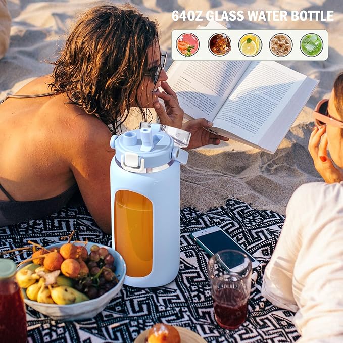 - Durable: The silicone sleeve covers most of the half gallon water bottle for protection. Not only does it keep your drinks cold for hours, but also makes this motivated glass water bottle more durable. The wide mouth of this huge glass water bottle makes it easier to refill large pieces of ice cubes and fruit, and with help of time and oz markers, you will easily track your daily water intake and drink more water throughout the day.