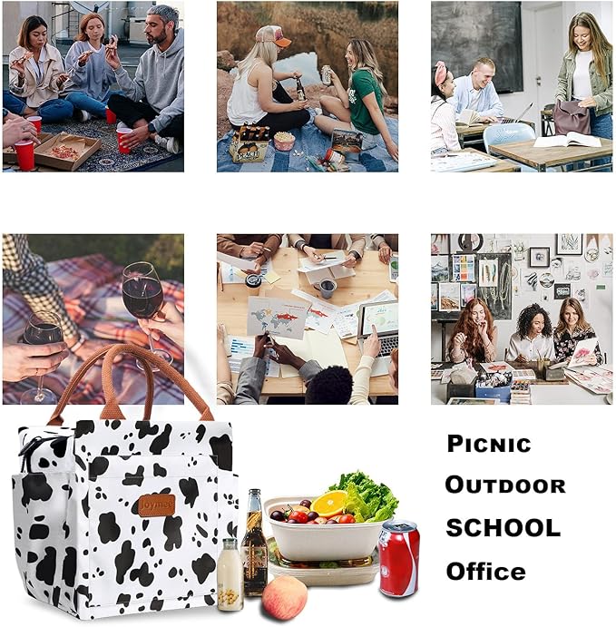 Joymee Lunch Bag Women Insulated Lunch Box Reusable Leakproof Large Spacious Cooler Tote for Womens Mens Adults with Bottle Holder and Side Pockets for Work Office Travel Picnic - Cow