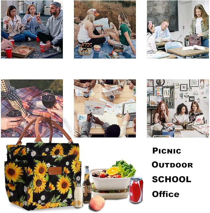 Joymee Lunch Bag Women Insulated Lunch Box Reusable Leakproof Large Spacious Cooler Tote for Womens Mens Adults with Bottle Holder and Side Pockets for Work Office Travel Picnic - Sunflower