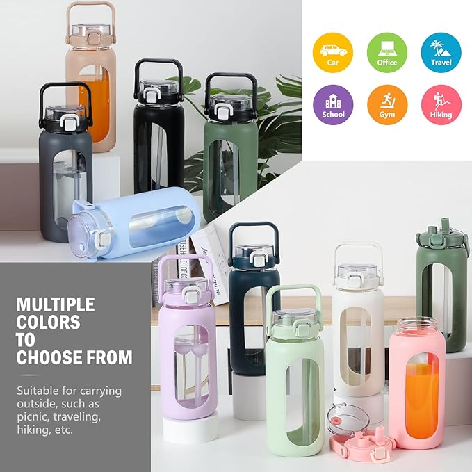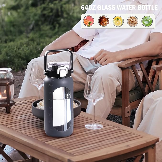 - Durable: The silicone sleeve covers most of the half gallon water bottle for protection. Not only does it keep your drinks cold for hours, but also makes this motivated glass water bottle more durable. The wide mouth of this huge glass water bottle makes it easier to refill large pieces of ice cubes and fruit, and with help of time and oz markers, you will easily track your daily water intake and drink more water throughout the day.