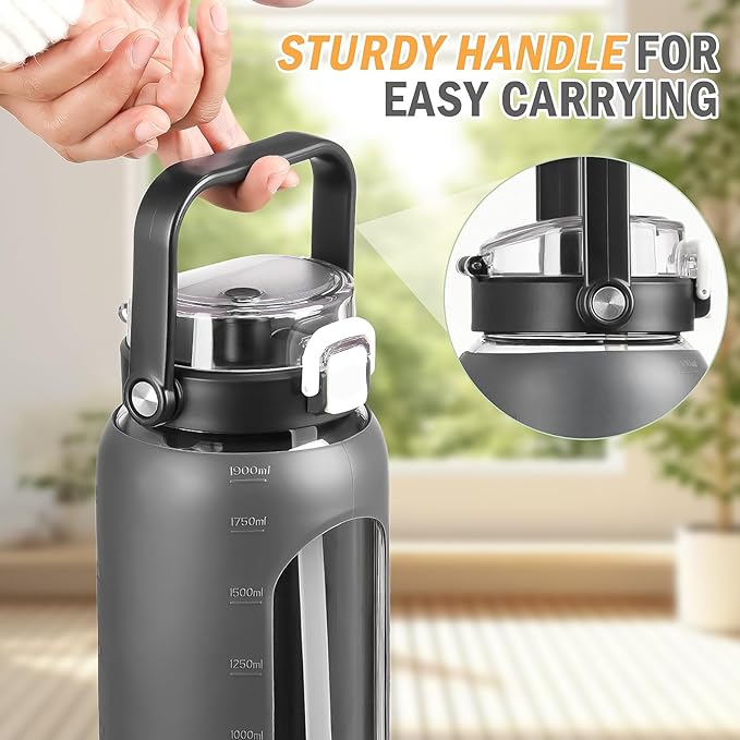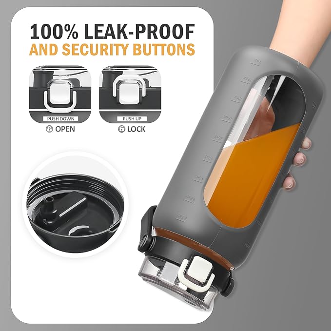 - Lockable & Leakproof Flip Lid: The handy, lockable flip lid prevents leaks and can be opened with one hand for those times when you’re on the move and your arms are full. Our leak-proof glass water bottle with straw makes your drinking dribble-free. The straw spout gives you a comfortable and quick drinking experience and this glass water bottles with time marker comes with 2 straws and the carrying handle on top makes it easy to tote around town.