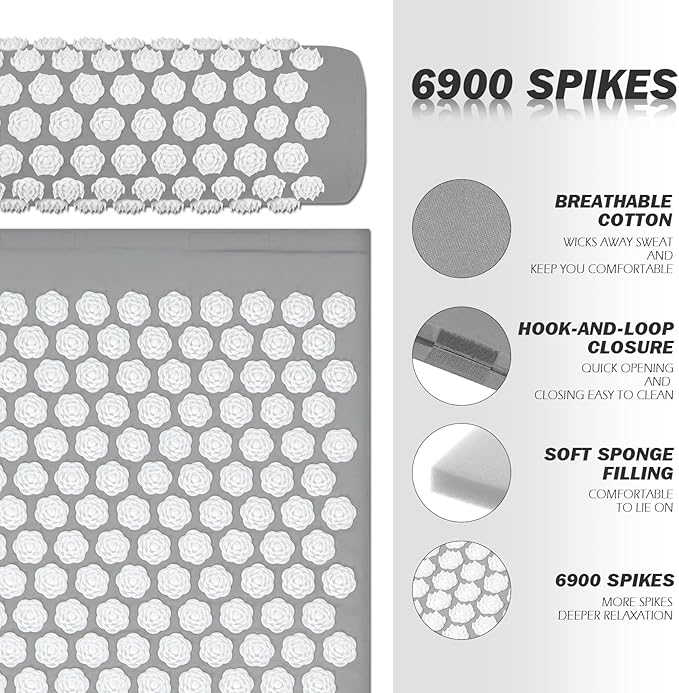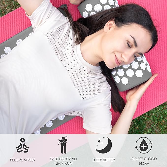 - 【EASE THE PAIN/TENSION/STRESS】- The acupressure mat and pillow has thousands of spikes which apply pressure to acupressure point, relieving the pain on back, shoulder, neck, shoulder, leg and bottom while stimulating blood circulation to relieve tension and stress.