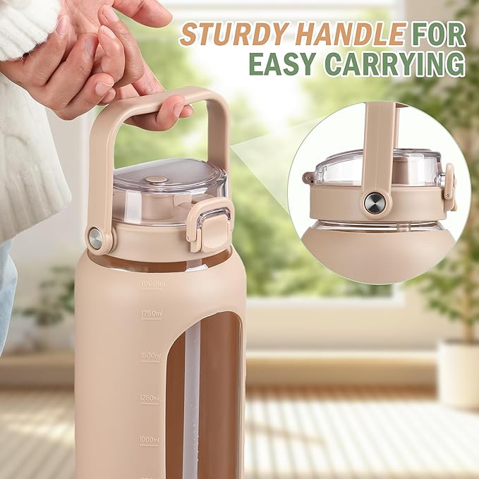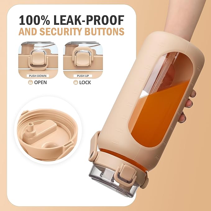 - Lockable & Leakproof Flip Lid: The handy, lockable flip lid prevents leaks and can be opened with one hand for those times when you’re on the move and your arms are full. Our leak-proof glass water bottle with straw makes your drinking dribble-free. The straw spout gives you a comfortable and quick drinking experience and this glass water bottles with time marker comes with 2 straws and the carrying handle on top makes it easy to tote around town.