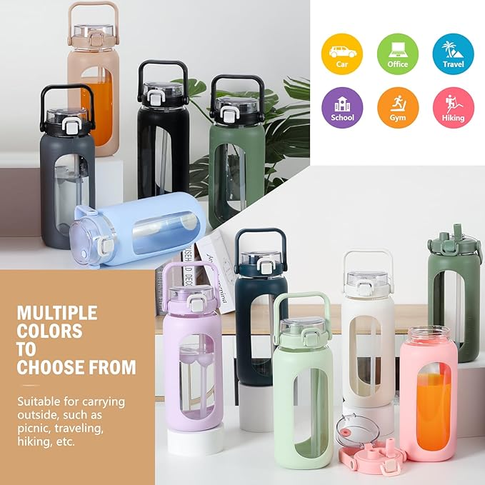 - Durable: The silicone sleeve covers most of the half gallon water bottle for protection. Not only does it keep your drinks cold for hours, but also makes this motivated glass water bottle more durable. The wide mouth of this huge glass water bottle makes it easier to refill large pieces of ice cubes and fruit, and with help of time and oz markers, you will easily track your daily water intake and drink more water throughout the day.