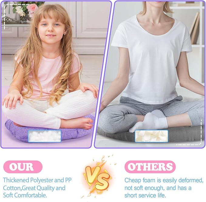- Quality and Soft: the round floor pillow for kids is made of quality polyester fiber fabric, filled with soft and stretchy PP cotton, soft and safe, not easy to run cotton, not easy to deform or fade, and can serve for a long time; Please notice that due to vacuum pack, cushions can spring back to its normal shape about 1 day after opening