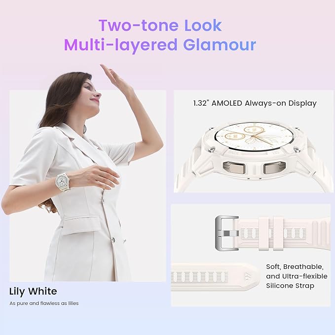 - ➤【Ultra-light Body & AMOLED Display】This smart watches for women weighs a mere 50 grams, with an ultra-soft silicone strap that offers an exceptionally comfortable and delightful wearing experience. 1.32 inch AMOLED display boasts a color gamut of up to 100% RGB, includes an always-on mode, double the brightness of other smartwatches, provide you an ultra-high-definition sensory experience and perfect for quick glances,