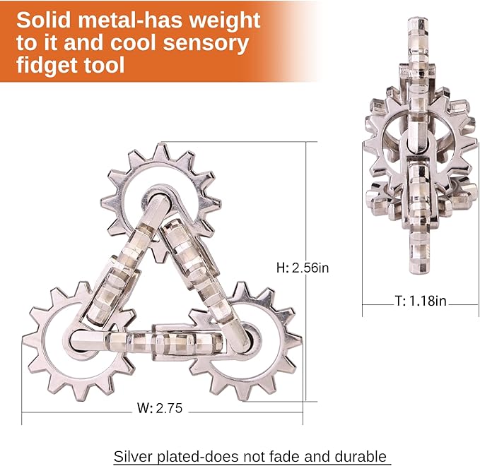 - TRIPLE FIDGETING EXPERIENCE: FEEL the tactile stimulation of the metal gear and the force of gravity in your hands, SEE the never ending turns of the gear and HEAR the satisfying metal-on-metal clinking sound (very little noise)