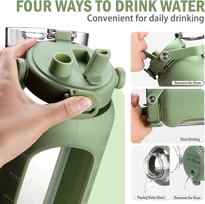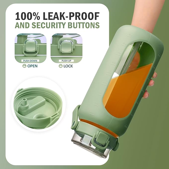 - Lockable & Leakproof Flip Lid: The handy, lockable flip lid prevents leaks and can be opened with one hand for those times when you’re on the move and your arms are full. Our leak-proof glass water bottle with straw makes your drinking dribble-free. The straw spout gives you a comfortable and quick drinking experience and this glass water bottles with time marker comes with 2 straws and the carrying handle on top makes it easy to tote around town.