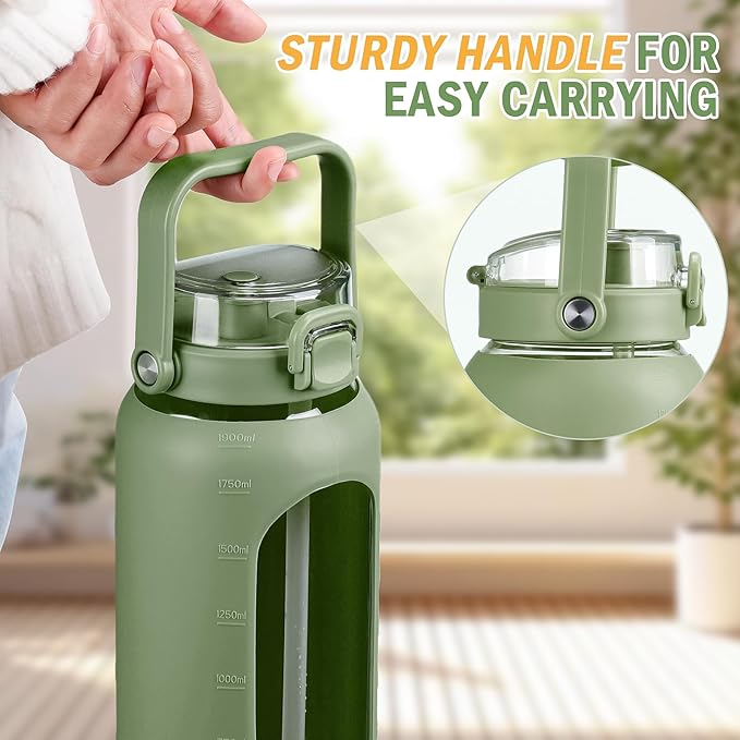 BLUEGO 64oz Glass Water Bottles with Straw Time Marker Half Gallon Large Motivational Water Bottle with Silicone Sleeve 2 Liter Large Glass Water Jug for Gym, Sports& Workout, Daily, 02 Olive
