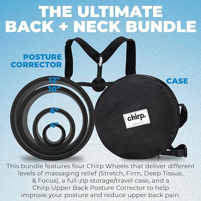 - Experience Maximum Comfort and Better Posture: Experience the benefits of improved posture and muscle care with the Chirp Ultimate Back + Neck Bundle. Our bundle, featuring 12"" Gentle, 10"" Firm, 6"" Deep Tissue, and 4"" Focus wheels, ensures you enjoy a comfortable and supportive experience as it works to enhance your posture.