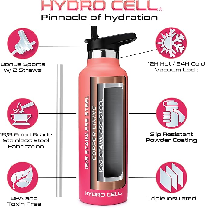 HYDRO CELL Stainless Steel Water Bottle with Straw & 2 Standard Mouth Lids (32oz 24oz 20oz 16oz) Keeps Liquids Hot or Cold w/Double Wall Vacuum Insulated Leak Proof Sport Design (Coral/Punch 24oz)