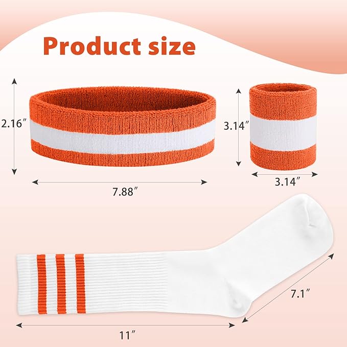 • πŸ’– SIZE: Fitness tennis headband approx.7.88" x 2.16", wrist sweatbands: 3.14" x 3 14", knee socks approx. 11" (28cm) length , high socks fit shoe size Men 6-12, Women 5-13. Over the calf length socks with triple stripes, 80s accessories for men are unisex and nice for year-round use, colorful designs make these sports sets very stylish and fashionable.