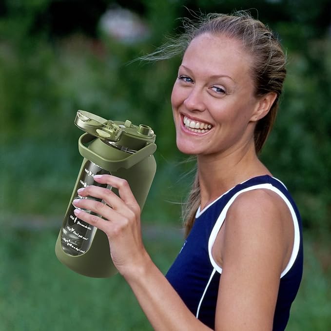 - More Function :This large glass water bottle with straw is designed with high-quality silicone sleeve to protect water bottle from slight bumps. In order to make the half-gallon(2.2 liters) big gym motivational water bottle easy to carry we have equipped it with handle