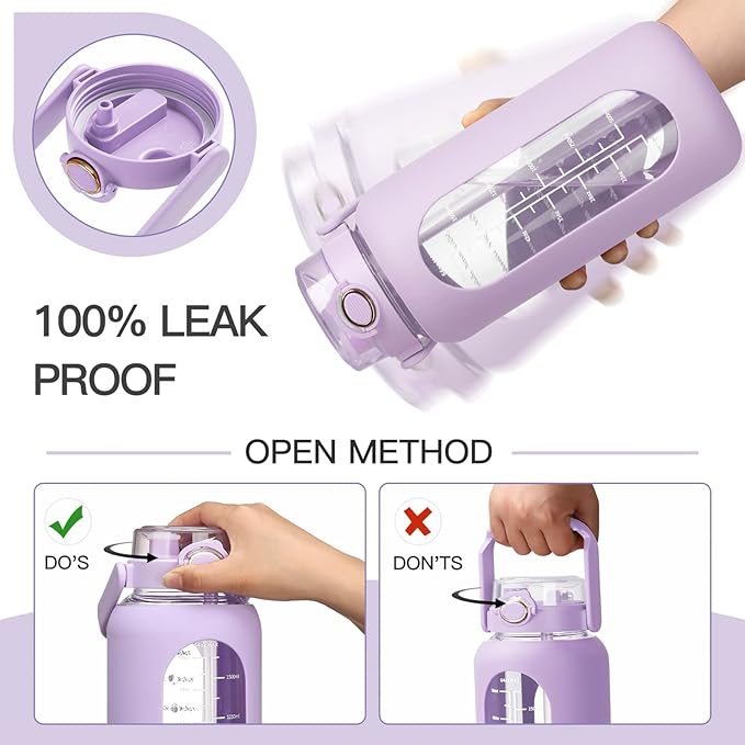 - 【Feature Details】The half gallon water bottle with straw has an anti-slip and high quality silicone sleeve to protect the glass water bottle and help prevent it from being slippery in your hands or slight bumps, it keeps standup stably.In order to make the big gym motivational water bottle easy to carry we have equipped it with handle.