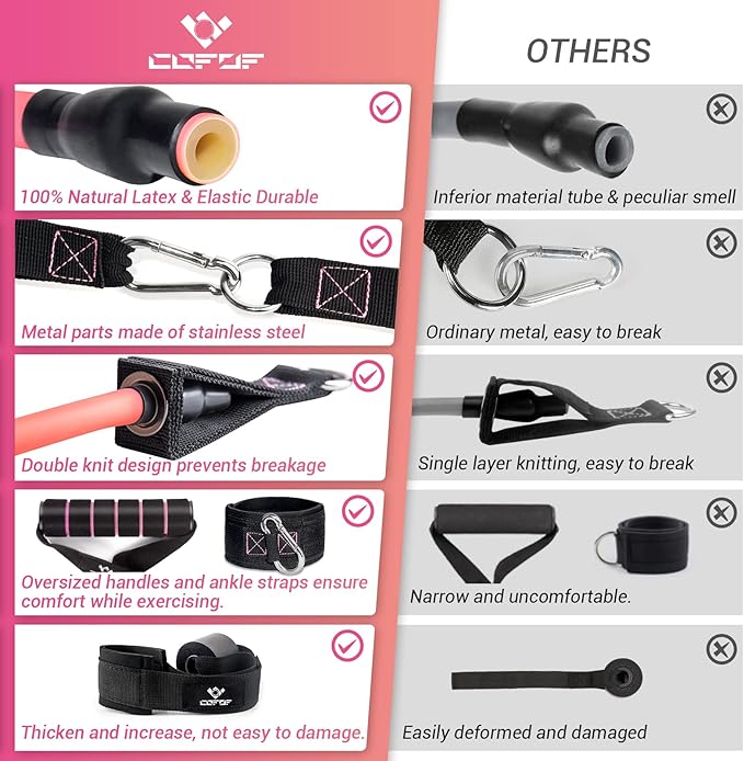 - 🌟High quality and thoughtful exercise bands resistance for women: these workout bands are made of eco-friendly natural latex, skin-friendly and harmless, with excellent durability and perfect elasticity. The metal buckles on the handles are extra strong to ensure safety during use. Soft, non-slip foam grips provide comfort. Soft and skin-friendly ensures comfort during exercise. Door anchors are thickened and soft so they won't damage your door.