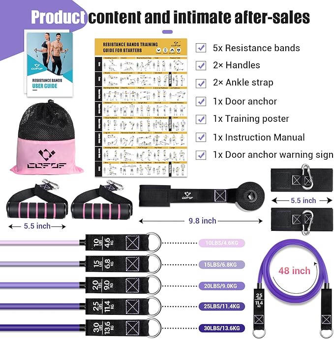 - 💞Upgraded Resistance Bands & After-sales Service: You will get resistance band*5, 2 handle, 2 ankle strap, 1 door anchor, 1 training poster, 1 instruction manual. To increase your workout intensity level, simply combine resistance bands with training posters to suit your workout needs. With resistance band exercises, you can get the perfect shape. If you encounter any problem while using the product, please contact us and we will help you to solve it within 12 hours.