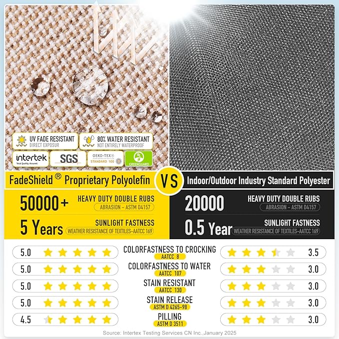 - 【FadeShield - UV Fade Resistant】FadeShield Proprietary Polyolefin are dependable indoor/outdoor performance fabrics, they are infused with antimiсrоbial silver Ion technology and can withstand 5 years of UV fade resistance, solution-dyed to make sure that each color is deeply ingrained in every fiber for continued vibrancy, even after heavy use. 80% water resistant (not entirely waterproof). We recommend bringing it indoors when it rains or when not in use to preserve its lifespan and keep it looking beautiful.