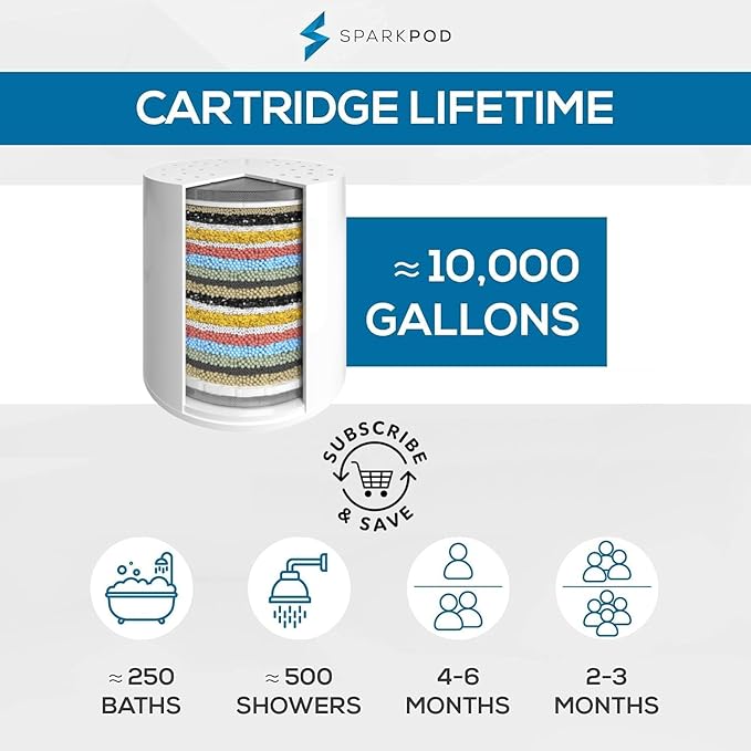 - REPLACEABLE CARTRIDGES: SparkPod’s new upgraded formula filters water to help with dry skin, rough hair and itchy skin. Enjoy 2-3 Months of filtered soft water per replacement Cartridge.