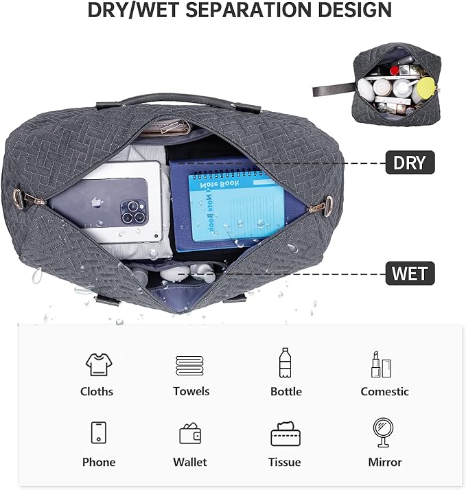 - DRY WET SEPARATED GYM BAG - Duffle bag women has an internal waterproof zipped pocket so if you can put wet clothes or wet stuff inside. It can be put dirty clothes inside either. The bag can not only be used as bag, but also can be hospital bag or mum bag.
