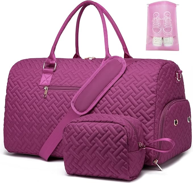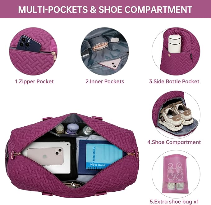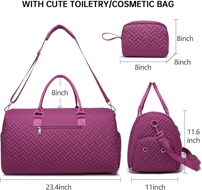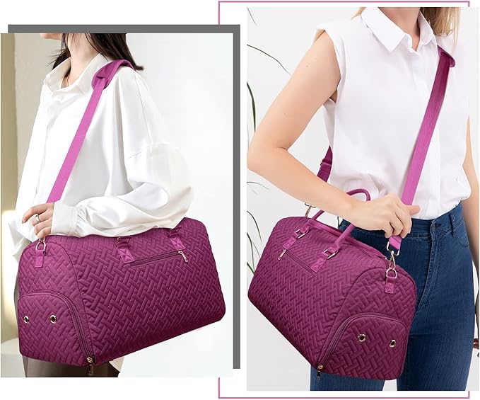 - TRAVEL BAG WITH SHOE COMPARTMENT - We have added a separate shoe compartment and a shoe bag(Size:17x12 inches). Travel bags for women has a shoe compartment to hold your shoes or dirty clothes, making it easy to separate them from your clean clothes when travelling. It also comes with a toiletry bag in which you can put your cosmetics, skincare products or toiletries.(Purplish red)