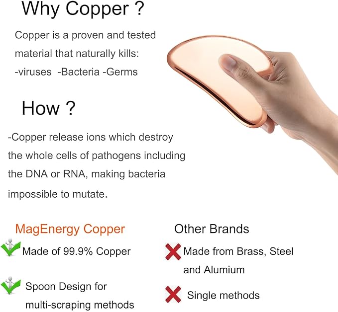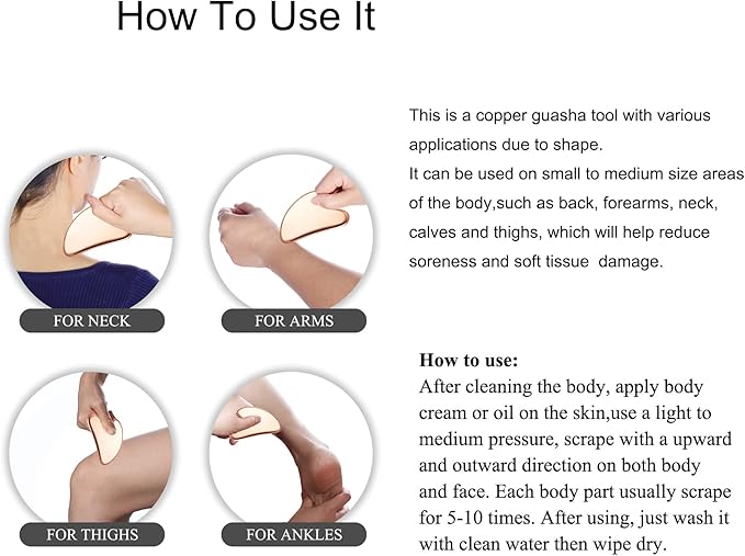 - Gua Sha Massage Tool: is made of Pure Solid Copper, which is HYPOALLERGENIC, LEAD & NICKEL FREE. copper is an essential trace mineral for survival and could be absorbed through skin.COPPER is a very calming and positive metal and also offers relief.