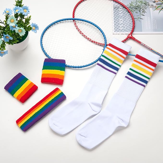 - π WHAT YOU WILL GET: 1 piece sport headband x 2 pieces wristbands, 1 pair of high tube socks (variety of colors for select); The good elasticity makes the sport sweat-wicking set fit most teens and adults to wear, suitable for both men and women, have them to make you stand out in the crowd or themed parties.