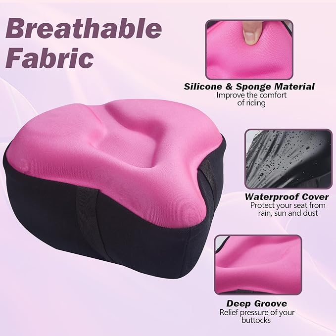 - Large Gel Bike Seat Cushion Covers : Soft gel bike seat cushion is padded with transparent silica gel, and surface is made of stretchy Spandex flbre material. High quality memory foam and gel padding exert no harm to health. Absorb shock and reduce pain effectively. Better protect your butts. Bring a healthier & more comfortable experience