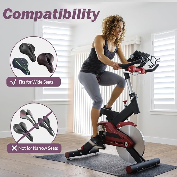 - Big Size & Compatibility : Wide bike gel seat saddle cover is 11.0 x 10.0 inches. The exercise bike seat cushion fit for Spin Class/peloton/nordictrack etc Indoor Stationary Cycling Spinning bike. Also fit for outdoor mountain MTB/road/commuter/cruiser comfor cycle. Please confirm this bike seat cushion can fit your original bike seat before ordering