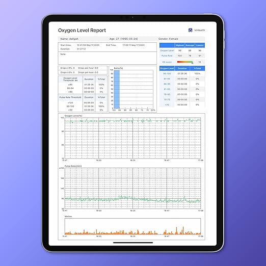 - Smart Data Management: Automatically stores 40 hours of measurements locally, 4 sets of 10-hour data; Instantly syncs to ViHealth app via Bluetooth for visual trend charts and unlimited PDF report sharing