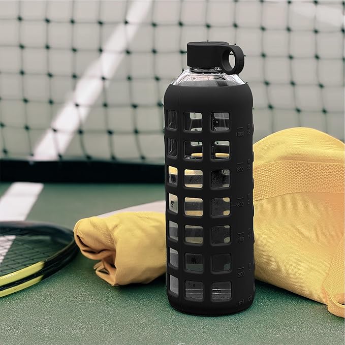 purifyou 40oz / 32oz / 22oz / 12oz Borosilicate Glass Water Bottle with Time & Volume Markers, Silicone Sleeve, Stainless Steel Lid | Reusable Glass Bottle for Water & Juice (32oz Jet Black)