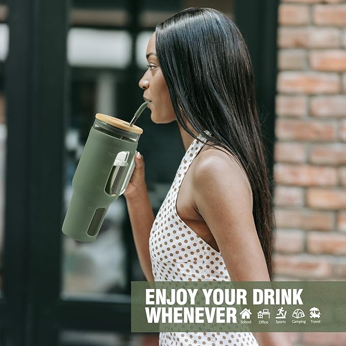 Glass Tumbler with Lid and Straw, 46 oz Iced Coffee Cup with Handle, Large Water Bottles with Silicone Sleeve, Glass Cup with Straws - Pearl Straw & Drinking Straw BPA Free-Olive