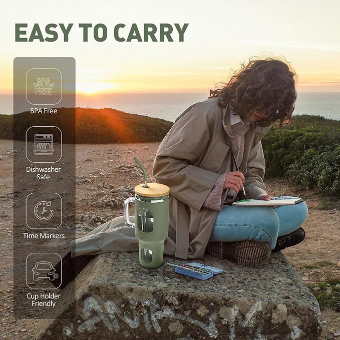 Glass Tumbler with Straw and Lid, 40 oz glass cup with handle, Glass Water Bottles with Time Marker, Silicone Protective Sleeve-Olive