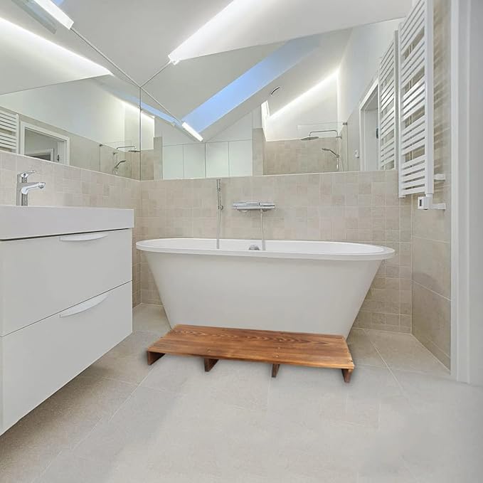 - 【Long and sturdy wood step stool】: With a 39.4'' length, this wooden step stool features four equally wide support legs and an 11.8'' width to accommodate different feet sizes. Its 4.3'' height makes it perfect for reaching high places.