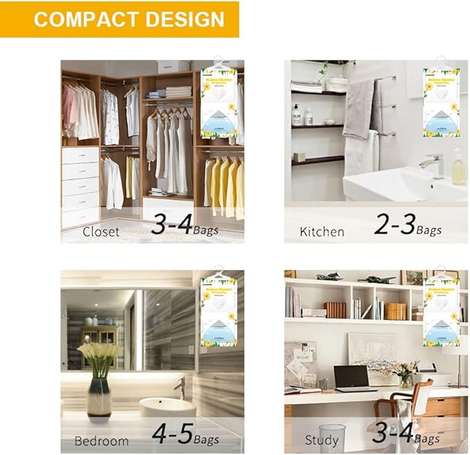 - 【Easy to use】The dehumidifier bag is easy to use and only needs to be hung in the required enclosed area. They can create clean and fresh air for you, and let you enjoy dry and comfortable indoor environment for a long time.