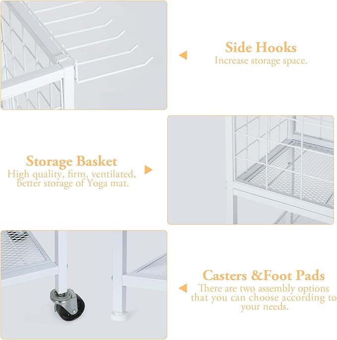 - 【360 ° wheels and hooks】 Our yoga mat storage rack is equipped with 4 movable casters and 4 adjustable casters for you to choose from. The casters make it easy for you to move, and two of the movable casters come with brakes to better secure the workout storage for yoga mat . There are hooks on both sides for hanging yoga straps and skipping ropes.