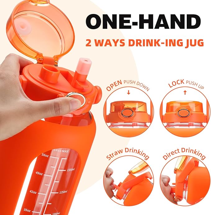 - Glass Water Bottle 64oz :The water jug with straw is designed with high-quality silicone sleeve to protect water bottle from slight bumps. In order to make the half-gallon(2 liters) big gym motivational water bottle easy to carry we have equipped it with handle. Wide-mouth opening make it easy to fill with ice cubes & fruits and daily clean