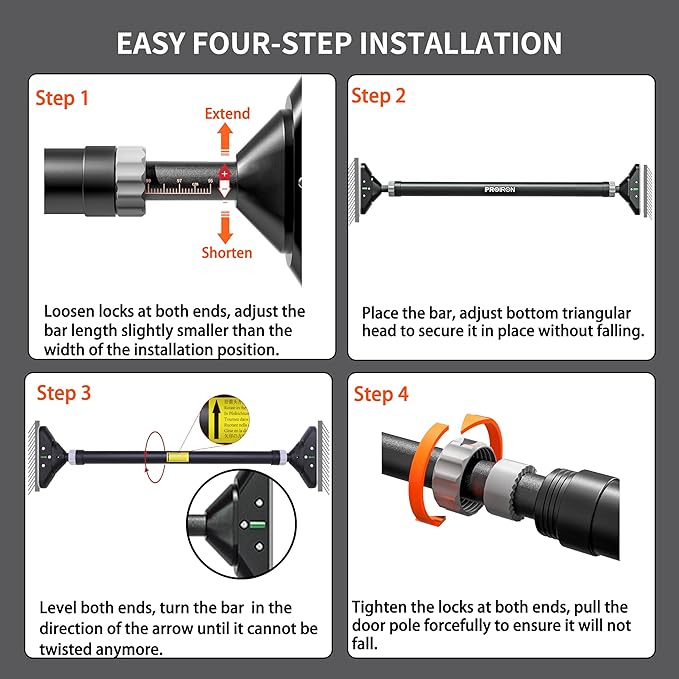 - 💪 【Easy Installation:No Drilling, NO Traces】Our pull up bar doorway installation is not tilted through Two High-precision spirit level, easy to install and effortless, you don't even need a screwdriver and fits most door frames, and can be assembled and disassembled in seconds. Using soft anti-skid PVC material on each side of the pull-up bar, our bar protects door frames from cracking.