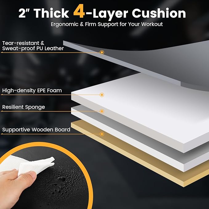 - 【High Quality PU Leather】 The workout bench is covered with tear-resistant & sweat-proof PU leather, which not only offers soft touch but also ensures great durability. In addition, the waterproof leather surface is easy to wipe clean.