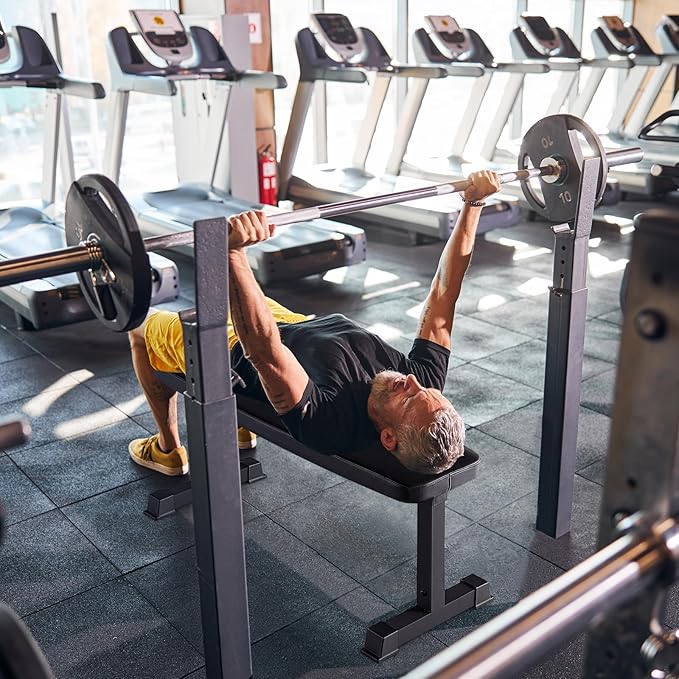 - 【Multifunctional Flat Weight Bench】 It is a utility weight bench for all kinds of upper and lower body exercises. You can use it to perform dumbbell row, bench press, leg raise, triceps dip and more. Plus, the light commercial fitness bench is perfect to use with barbell racks or power racks.