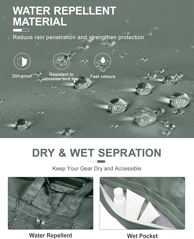 - 【Waterproof & Dry Wet Pocket】The bag is made from high-density waterproof material to repel water and keep the contents inside dry. The bag has a compartment designed specifically for separating dry items from wet ones like wet clothes or towels