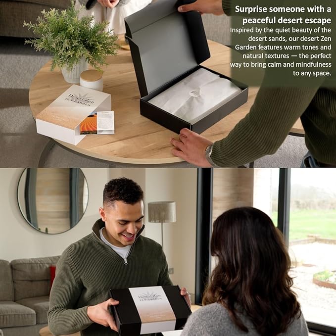 - Wonderful High End Gift. Reward yourself or bring calm & happiness to loved ones. Desert version of a desk Zen Garden gorgeously packaged with the elements for inner peace. A deluxe Zen decor gift set