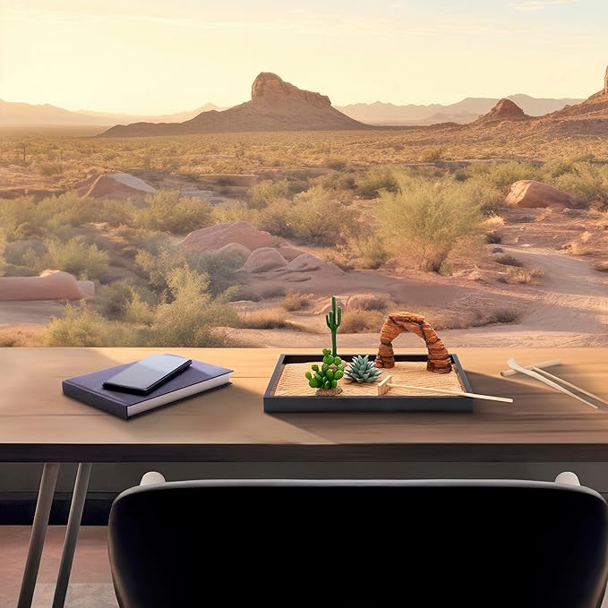 Desert Zen Garden Kit. Premium Home Cactus Decor. 11x8 Sand Tray. 4 Artificial Features, Brown Sand, 3 Handcrafted Wood Tools. Southwestern Desert Decor Zen Garden for Desk Therapy